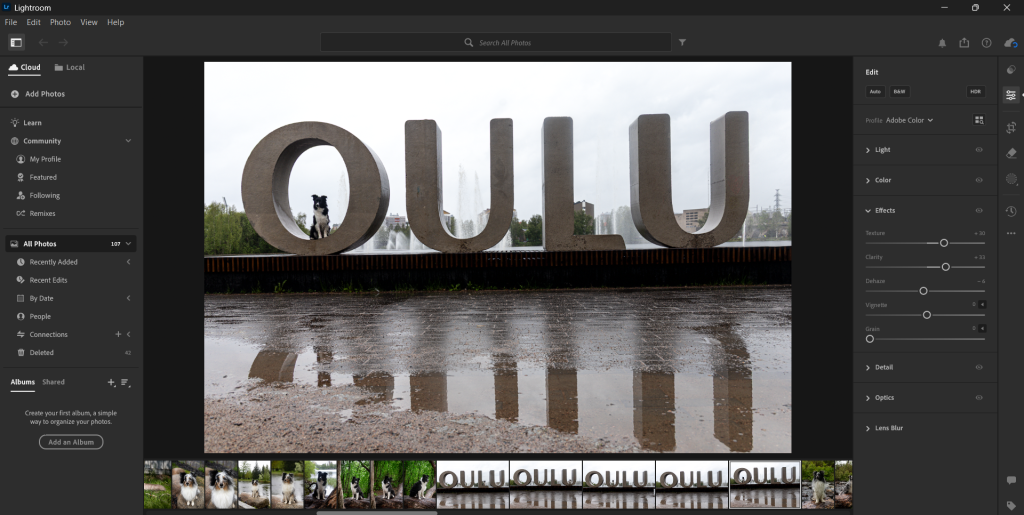 Käytin aluksi lightroomia kaikkien kuvien editointiin jotta värit valot ja varjot sopisivat yhteen.