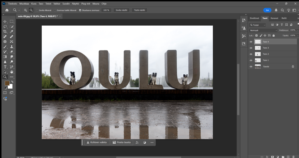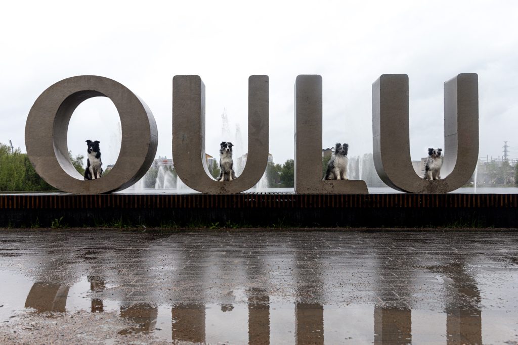 Ideana oli saada koirat samaan kuvaan Oulu kyltin eteen ja koska tiesin että en saisi millään kaikkia kerralla samaan kivaan päätin sitten että otan kaikista yksittäin kuvat ja editoin ne yhteen.